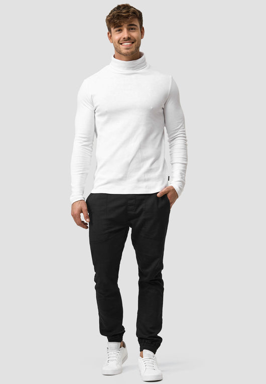 Der fein gerippte Rollkragen schützt zuverlässig vor Kälte, ohne zu dick aufzutragen. Die Bündchen an Ärmeln und Saum sind dezent gehalten und sorgen für einen sauberen Abschluss. Ein kleines Logo-Detail am Saum rundet das Design unauffällig ab. Herren Eagon Langarmshirt mit Rollkragen aus 100% Baumwolle