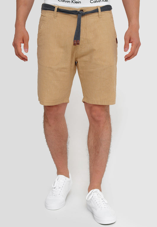 Diese stilvollen Herrenshorts vereinen Komfort und Eleganz in einem lässigen Design. Das feine, durchgehende Streifenmuster verleiht ihnen eine klassische und zugleich moderne Optik. Sie sind mit einem Knopf- und Reißverschluss ausgestattet und verfügen über Gürtelschlaufen für zusätzliche Styling-Möglichkeiten. Ein passender, geflochtener Stoffgürtel mit dekorativen Lederdetails sorgt für eine stilvolle Ergänzung. Die Shorts bieten zwei seitliche Eingrifftaschen sowie eine kleine Logo-Applikation an der Seite. Das leichte und atmungsaktive Material gewährleistet ein angenehmes Tragegefühl und macht sie ideal für Freizeit- und Sommeroutfits. Herren Enford Shorts mit Kordelzug aus 45% Baumwolle & 55% Leine